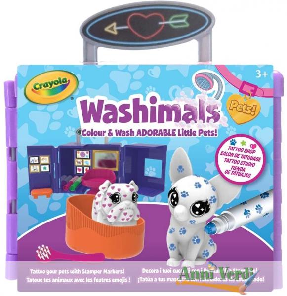 La confezione include 1 playset tattoo studio, 2 cuccioli lavabili(chihuahua,bulldog), 3 pennarelli a stampino Washimals, 1 spazzola e 1 vasca.