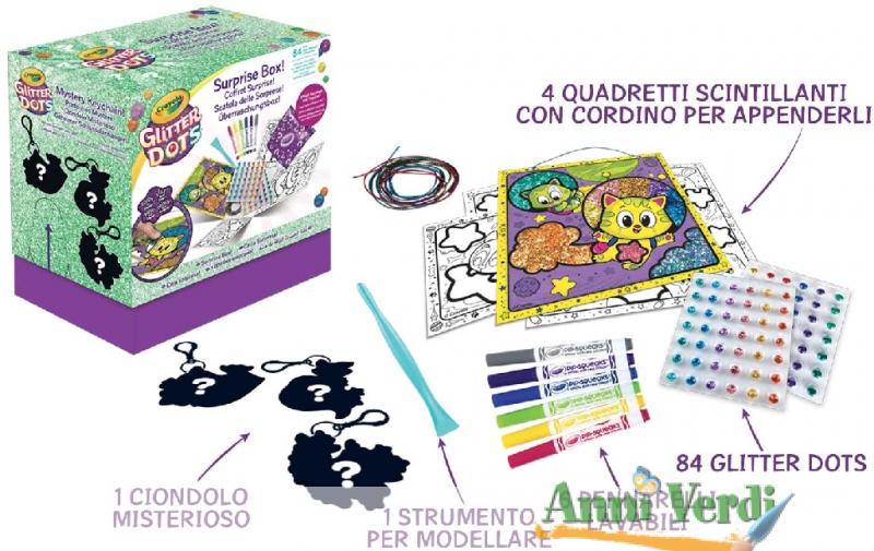 Contenuto: 84 Glitter Dots, 4 quadretti scintillanti con cordino per appenderli, 1 ciondolo misterioso, 6 pennarelli lavabili, 1 portachiavi, strumento per modellare