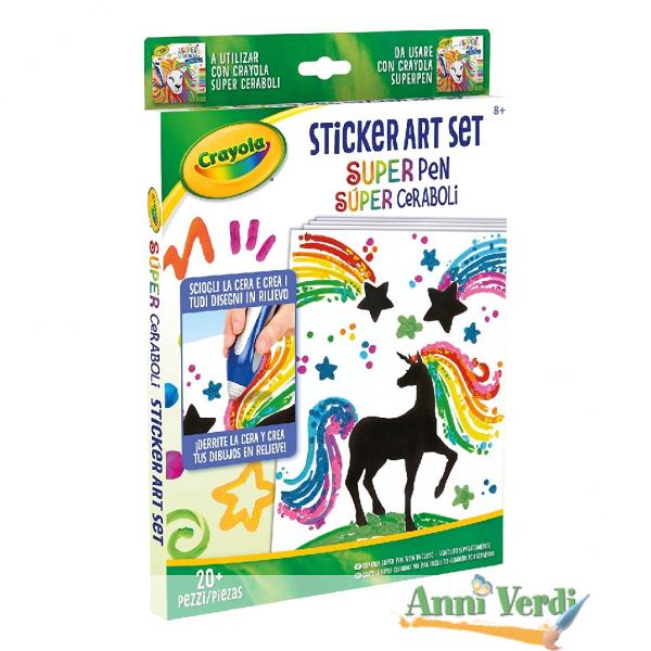 Sticker Art Set è il set ricarica da utilizzare con Crayola Super Pen, la penna che scioglie la cera per creare i disegni in rilievo
