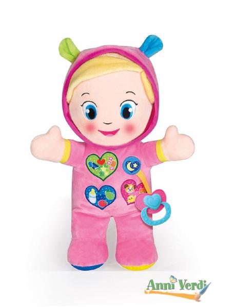 È una tenerissima bambola educativa parlante in stoffa con la quale giocare e imparare in un mondo di dolcezza!