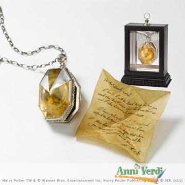 Riproduzione originale del falso Horcrux trovato da Silente e Harry nel film Harry Potter e il Principe Mezzosangue. Il medaglione è munito di scomparto interno e di messaggio destinato al Signore Oscuro, esattamente come nel film. L'articolo è munito di espositore da collezione in legno e vetro, con fondo a specchio. Dimensioni medaglione 7 x 5 cm circa.